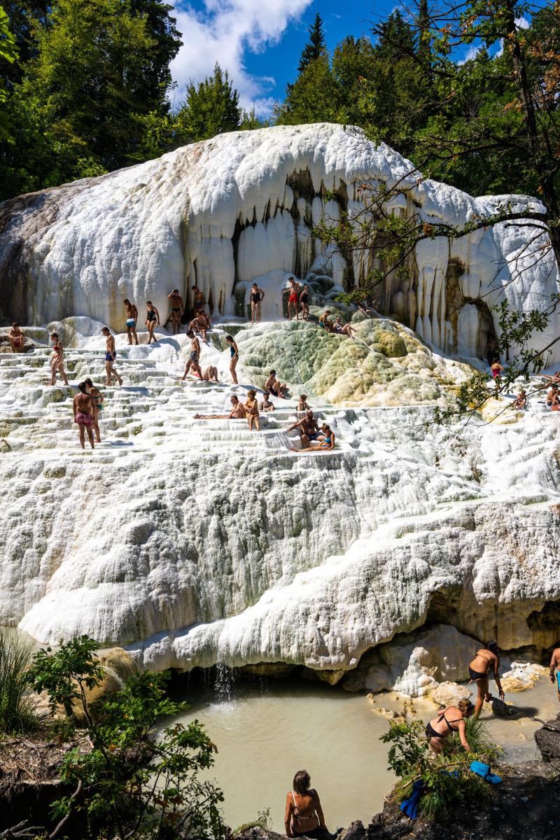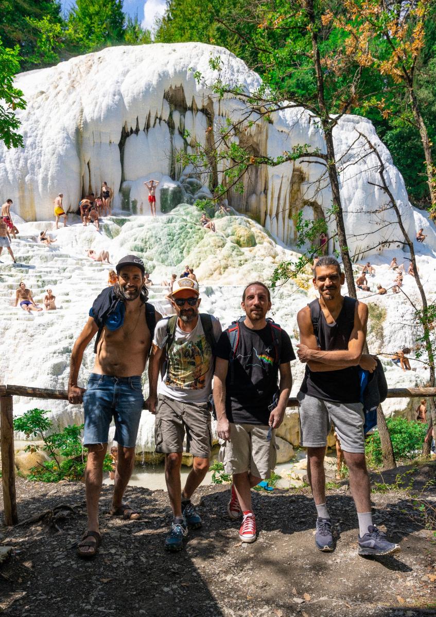 Partenza al mattino in direzione Bagni di San Filippo, nient’altro che delle terme naturali poco distanti dal Monte Amiata (in cui si trova anche uno splendido Bike Park per discesisti e amanti del downhill), ad accesso completamente gratuito, caratterizzate da queste rocce di colore bianco azzurro davvero uniche nel loro genere, che lasciano semplicemente a bocca aperta. Il luogo è molto frequentato, ma tutto sommato non è stato un bagno di folla, piuttosto un condividere la bellezza di uno spazio aperto a tutti e quindi “di tutti”, respirando però nell’aria quellatmosfera di “chicca nascosta” che ancora un po’ si riesce ad apprezzare. Oltre ovviamente alla pesantezza degli effluvi sulfurei che fuoriescono dalla pozze.
